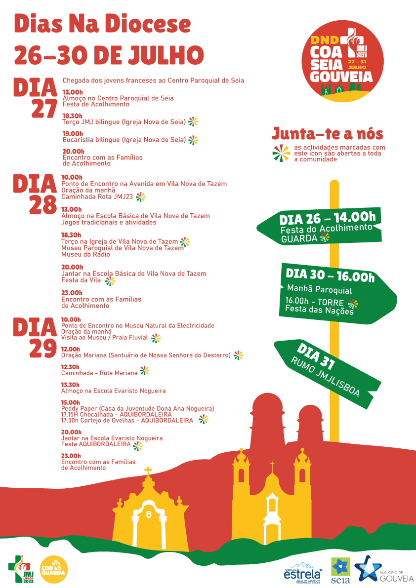Para assinalar a chegada dos jovens peregrinos à diocese, o COD realizará, na tarde do dia 26, uma festa de acolhimento na cidade da Guarda, que incluirá a celebração da Eucaristia na Sé, presidida pelo bispo da diocese, Manuel Felício, e animada musicalmente por um coro de jovens criado especialmente para este efeito.